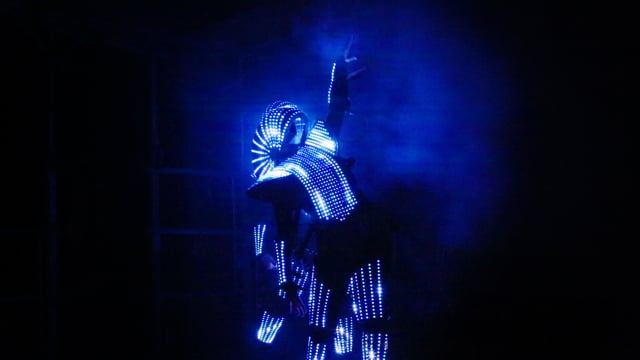 Showen framförs av en av Skandinaviens ledande LED-showartister i spegeldräkt.