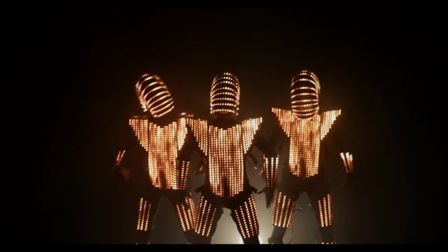 Ljuset släcks ner och 2-3 mörka LED robotar tar plats på scenen till stämningsbyggande musik. Dräkterna blixtrar till och laddas upp till fullt lysande samtidigt som musiken trappas upp. På given signal drar låten igång med full energi och showen är igång. Noggrann programmering och avancerad teknik får LED- robotarna att växla mellan olika färger, mönster och snygga effekter, allt i takt till musiken och artisternas rörelser.